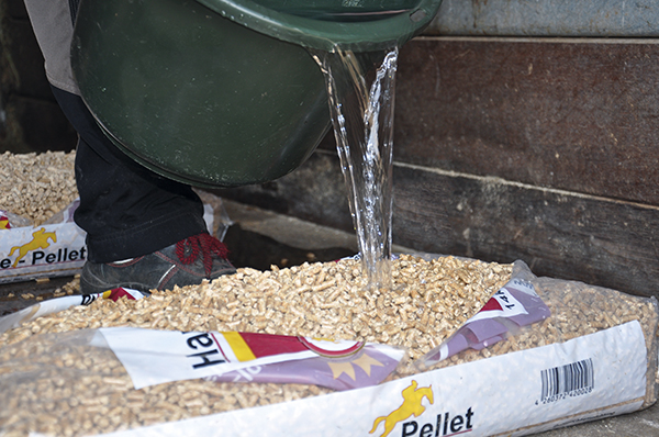 Feuchten Sie die Einstreu-Pellets vor oder nach dem Ausbringen mit Wasser an. Die Pellets quellen hierdurch auf, dieses beschleunigt das Bilden einer Spänematratze. Nach dem Anfeuchten verteilen Sie die aufgequollene Einstreu zu einer ca. 5-7 cm starken Spänematratze.